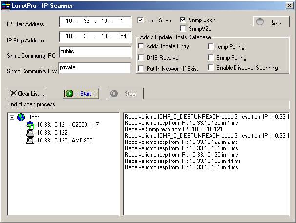 Discover algorithm: (ICMP echo request based – ping)Another method of discovering hosts is to use the LoriotPro IP Scanner. This one is able to do an exhaustive scan of all IP addresses of an IP subnet.