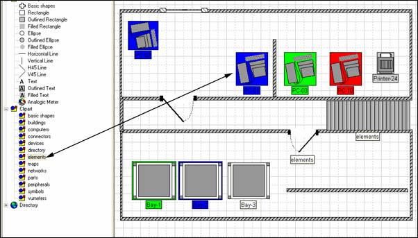 When the topological view is built, you could add dynamic objects like PC, printers, Bays, routers and switch.