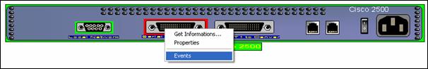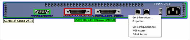 The upper example shows an Active View of a Cisco router and its contextual menu. A left click anywhere on the front panel opens the contextual menu. Three action are define, one call a Cisco configuration Plug-in, the second one calls the WEB access and the third do a telnet.