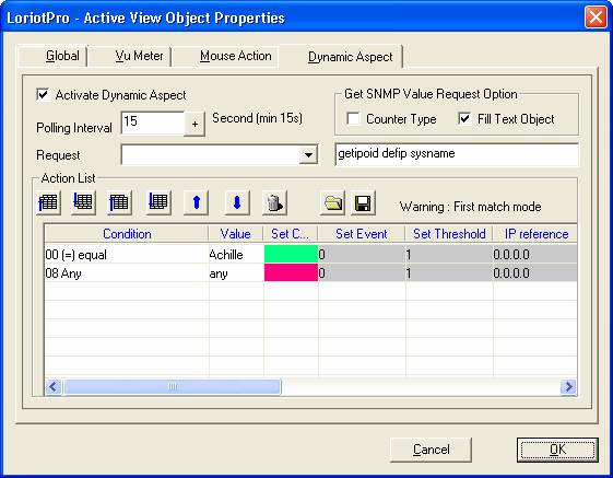Setting the Dynamic aspect of the Text objectLike other object, the Text object could be Dynamic but unlike other objects the text of the text object has the capability to be dynamically changed. The contents of the text could be defined initially (static text) or reflect the value of an SNMP object. The value of the SNMP object is either a text or an integer but for the Text object is always considered as a text string.