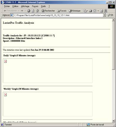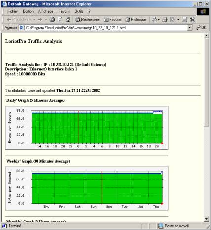 The use of MRTG in a window environment needs other software modules such as a Perl interpreter. The goal of LoriotPro is to be able to generate graphics like MRTG but without using the Perl interpreter and configuration files. LoriotPro could not only do that successfully but also allows the attachment of tasks (drawing graphics) to any host of the Directory. In fact, LoriotPro only uses the rateup.exe program of the MRTG software suite, this one creates the gif image format from the SNMP data collected by LoriotPro This gif images are displayed in HTML pages.