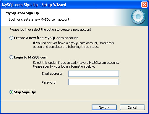 After installation the following windows allow you to create an account on the mysql web site.