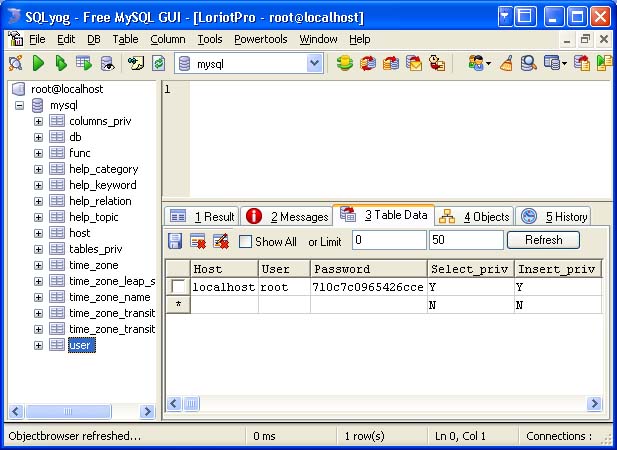 Click the connect. The following screen is displayed. You can now see for example the user table that contains the root user by selecting the Table Data tab on the right pane and the user tree option on the left pane.