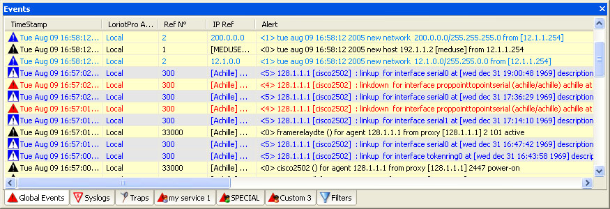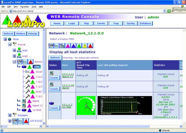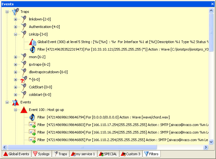 LoriotPro can also receive event messages (called traps) from managed devices and warn the administrator of exceptions or problems by playing a sound, sending a console message, or by highlighting or blinking an icon in a map. Traps report when an exception occurs or a preset threshold has been exceeded.