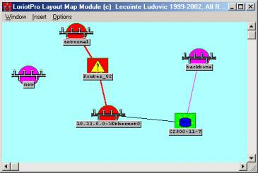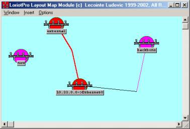 The software, by default, sets the object on the network map but this is not necessarily the object's real location. Later on, you can arrange the network map by moving icons where you want by simply using the drag-and-drop function. This command destroys all your settings and reorganizes the objects' locations. Remark: The algorithm used is CPU time consumption and should be cautiously started on a small inter-network only (50-150 routers/networks). It is possible to manually locate the router on the network map and to let LoriotPro locate the network objects. |
