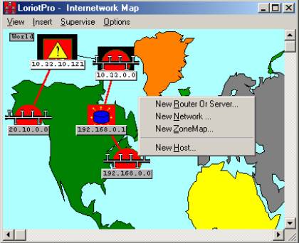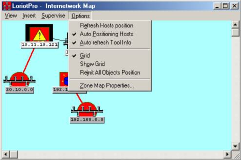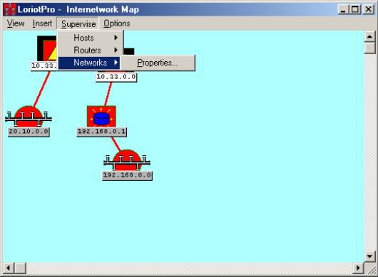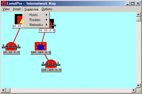Remark: The inter-network Map window uses three common objects: the host type, the router type, and the network type. These objects are displayed on a black background and texts are in black on a white background. All supervision functions can be applied to this three object types.